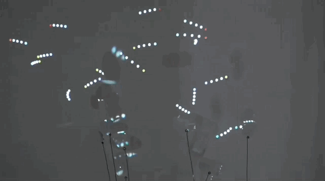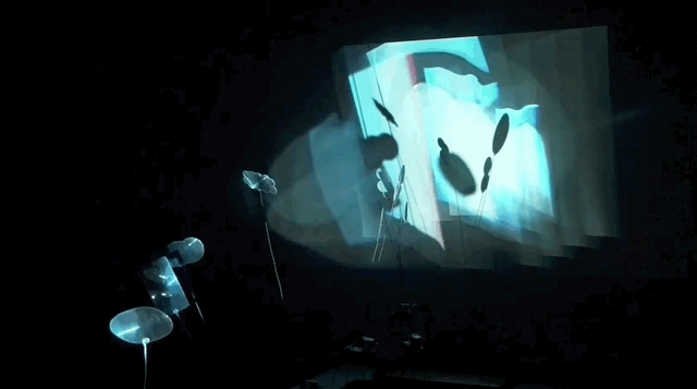 Each of the six mechanisms contain a small, off-set motor and battery pack, held up by a wire armature of four legs and one to two antennas to which lenticular lenses are attached. The motor’s off-set rotation creates a vibration, which causes the entire mechanism to jitter and move on its feet. Each stands in half of a circular film canister placed on the table, allowing a small range of movement within the projector’s line of sight. As the mechanisms vibrate and move, the lenticular lenses magnify and refract the light of the projected image in different ways, depending on their angle and distance from the projector. The vibration of the lenses, their wires, and even the motor’s spinning shafts, make the projector’s own rotating colour discs visible, separating the red, green, and blue colour channels. When I began drawing and building these creatures I didn’t have a clear idea of what they were supposed to be, but somewhere in the process I began thinking of them as pixels.